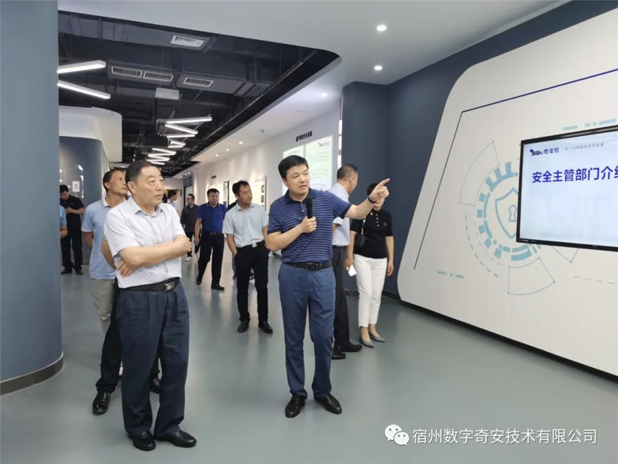 调研活动考察了奇安信(宿州)基地的智慧城市态势感知运营中心,朱局长对网络安全防御平台和态势感知平台进行了深入了解,并就网络安全、数据安全、政务云安全等相关技术进行深度交流 。
